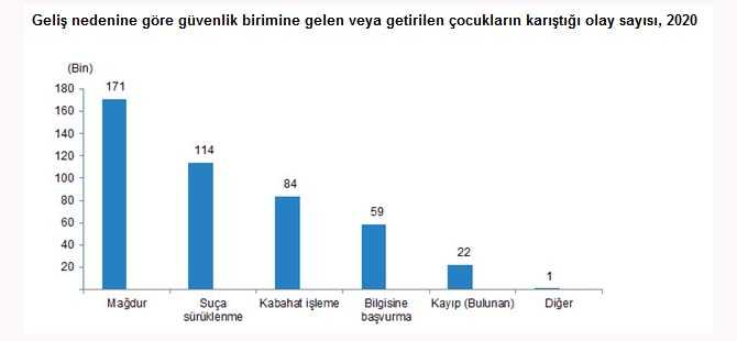 Güvenlik birimlerine 2020 yılında gelen veya getirilen çocukların karıştığı olay sayısı 450 bin 803 oldu. Bu olaylarda çocukların %37,9'unun mağdur olarak, %25,3'ünün kanunlarda suç olarak tanımlanan bir fiili işlediği iddiasıyla (suça sürüklenme), %18,5'inin kabahat işlediği iddiasıyla, %13,0'ının bilgisine başvurma amacıyla, %5,0'ının kayıp (hakkında kayıp müracaatı yapılıp daha sonra bulunan) olması sebebiyle, %0,2'sinin ise bu nedenlerin dışındaki diğer nedenlerden dolayı güvenlik birimlerine geldiği tespit edildi.
