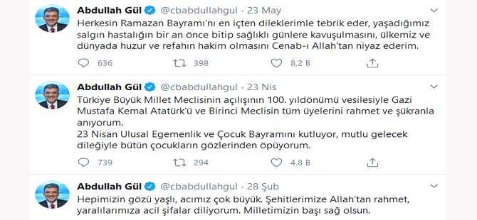 Eski Cumhurbaşkanı Abdullah Gül artık bayramdan bayrama konuşuyor gibi bir görüntü var. Bir sonraki twit Kurban Bayramı'nda mı olur bilinmez! Ama o kadar sürmez kanaati hakim!