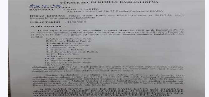 YSK'nin son kararına göre yerel seçimlere katılamayacağı açıklanan Adalet Partisi'nden itiraz geldi.