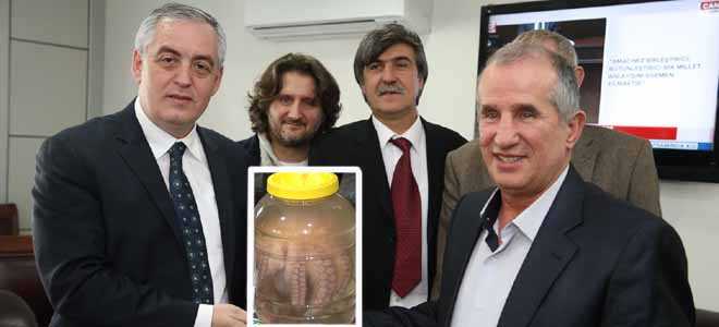 Turşucular Başkan Aydın'a bir plaket takdim ederken, özel olarak hazırlanmış ahtapot turşusunu da hediye ettiler.