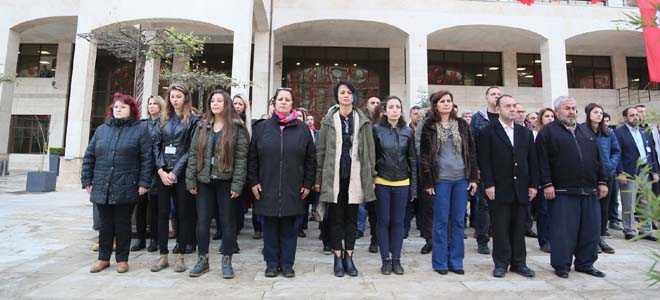 Saatler 09.05'i gösterdiğinde belediye çalışanları bina dışarısında Türk Bayrakları'nın karşısında saygı duruşunda bulundu.