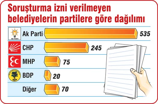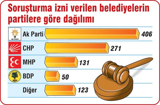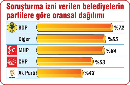 Şahin’in verdiği rakamlara göre, en fazla soruşturma izni talep edilen belediyeler Ak Partili olmasına karşın, en fazla oranla soruşturma izni reddedilen belediyelerin de Ak Partili olması dikkati çekti. Açıklanan rakamlara göre, soruşturma izni talep edilen belediyelerden soruşturma izni verilenlerin oransal değeri partilere göre şöyle: