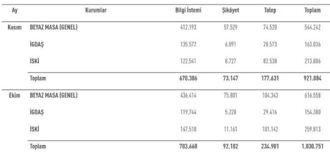Ekim ayına göre bilgi istemi başvuruları %4,7, şikâyet başvuruları %20,6 ve talep başvuruları %24,4 azaldı. Ekim ayında şikâyetler içindeki payı %82,2 olan Beyaz Masa (Genel), Kasım ayında %78,6'ya geriledi. Ekim ayında %44,4 seviyesinde gerçekleşen talep başvurularının payı ise Kasım ayında %42 olarak gerçekleşti.