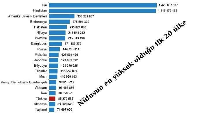 Türkiye, nüfus büyüklüğüne göre sıralamada 194 ülke arasında 18. sırada yer aldı.