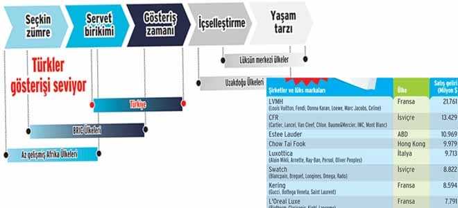 Lüks tüketim açısından henüz “gösteriş zamanı” evresini yaşayan Türki-ye’den, listeye giren firma yok. Demografik trendler, artan turizm ve Türk dizileri-nin etkisi ile 2018’de pazar 7 milyar liraya ulaşacak. Pazarın bugünkü büyüklüğü 5,3 milyar lira olarak tahmin ediliyor. n