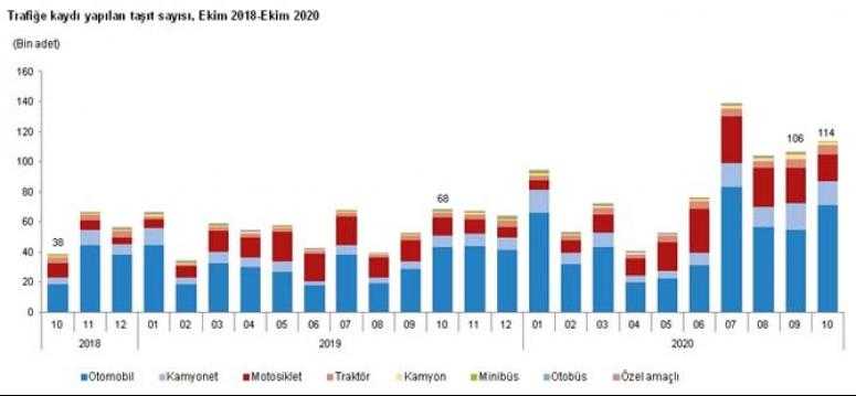 Ocak-Ekim döneminde bir önceki yılın aynı dönemine göre trafiğe kaydı yapılan taşıt sayısı %57,5 artarak 850 bin 969 adet olurken, trafikten kaydı silinen taşıt sayısı %84,4 azalarak 39 bin 571 adet oldu. Böylece Ocak-Ekim döneminde trafikteki toplam taşıt sayısında 811 bin 398 adet artış gerçekleşti.