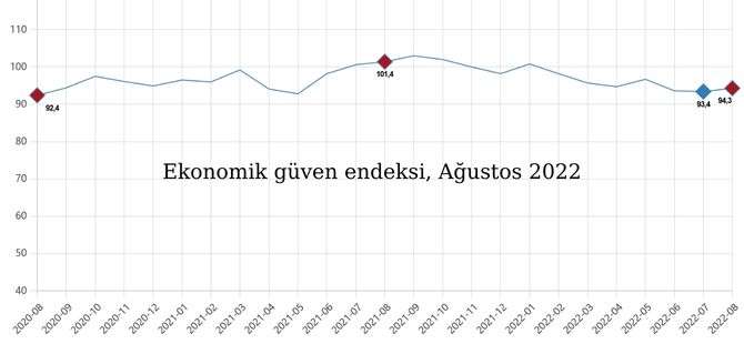 Ekonomik güven endeksi Temmuz ayında 93,4 iken, Ağustos ayında %1,0 oranında artarak 94,3 değerini aldı.