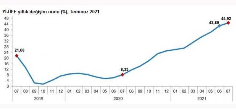 Yİ-ÜFE (2003=100) 2021 yılı Temmuz ayında bir önceki aya göre %2,46, bir önceki yılın Aralık ayına göre %25,05, bir önceki yılın aynı ayına göre %44,92 ve on iki aylık ortalamalara göre %28,47 artış gösterdi.