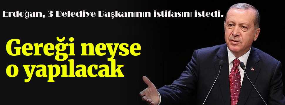 Cumhurbaşkanı Erdoğan, belediye başkanlarının istifasının istenmesiyle ilgili olarak, "Şu an 3 belediye başkanımız istifalarını verdiler, 3 belediye başkanımız daha var. Onların da istifalarını en kısa zamanda vereceğine inanıyorum. Onlar da bize kalmadan gereğini yaparlar, yapmaları da lazım" dedi.