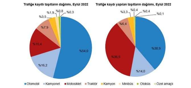 Eylül ayında trafiğe kaydı yapılan taşıtların %38,9'unu otomobil, %36,5'ini motosiklet, %14,0'ını kamyonet, %6,4'ünü traktör, %3,3'ünü kamyon, %0,4'ünü otobüs, %0,4'ünü minibüs ve %0,1'ini özel amaçlı taşıtlar oluşturdu.
