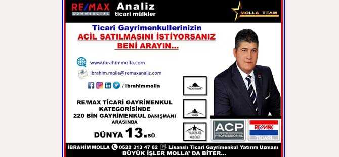 2018 Yılı Remax Ticari Gayrimenkul Sıralamasinda 13. olan İbrahim Molla, bölgedeki yatırımcı ve iş adamlarına kazandırmaya devam ediyor...