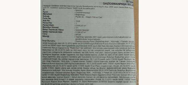 Gaziosmanpaşa Belediyesi'ne ait olan Bağlarbaşı 1428 ada 1 parselde yer alan 5.658 metrekare arsanın 5.285 metrekaresi satışa sunuluyor.