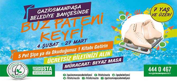 Gaziosmanpaşa Belediyesi, buz pateni keyfini ilçeye taşıyor. 5 adet pet şişe veya okuduğu bir kitabı getirenler 4 Şubat-27 Mart tarihleri arasında belediye bahçesinde hizmet verecek olan buz pateni keyfini ücretsiz yaşayacak.