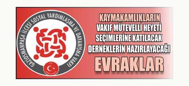 5263 Sayılı Sosyal Yardımlaşma ve Dayanışma Genel Müdürlüğü Teşkilat ve Görevleri Hakkındaki Kanunun 19 uncu maddesiyle 3294 sayılı kanunun değiştirilen 7 nci maddesi uyarınca, Gaziosmanpaşa dahilinde kurulan ve 3294 sayılı Sosyal Yardımlaşma ve Dayanışmayı Teşvik kanunda belirtilen amaçlara yönelik faaliyette bulunan Sivil Toplum Kuruluşlarının yöneticilerinin kendi aralarında seçecekleri bir temsilcinin İlçe Vakıf Mütevelli Heyetinde görev alması hükme bağlanmıştır.