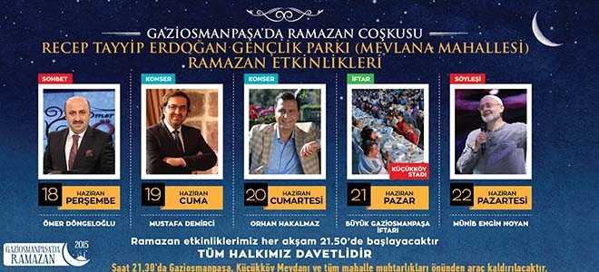 2015 yılı Ramazan ayı Gaziosmanpaşa’da, bu kutsal ayın maneviyatına uygun programlarla, çocuklara özel etkinliklerle ve kalpten kalbe sohbetlerle kulluğu hatırlatan bir bilinçle yaşanacak. ‘Onbir ayın sultanı’ Ramazan ayının manevi atmosferi ve bir şenliği andıran coşkusu Gaziosmanpaşa Belediyesi’nce gerçekleştirilecek sohbet, söyleşi, konser, kitap imza günü ve tiyatro gibi etkinliklerle hissedilecek. Gaziosmanpaşa halkı bu etkinliklerin yanı sıra ilçenin 16 mahallesinde gerçekleştirilecek sokak iftarlarıyla aynı sofrada ekmeklerini paylaşmanın ve oruç açmanın mutluluğunu yaşayacak. Büyük Gaziosmanpaşa İftarı ise Prof. Dr. Nihat Hatipoğlu Hoca’nın vereceği sohbet ve dualarıyla gerçekleştirilecek.