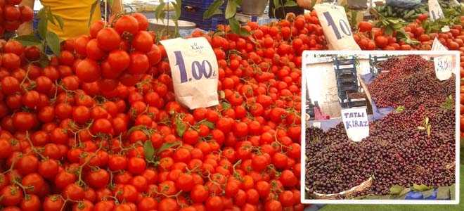 Karpuz'da fiyat halen daha yüksek! Karpuzun kilosu 2 Lira... Sivri biber fiyatı 2 Lira, biraz daha düşmesi lazım. Kiraz 2.5 Lira ile 5 Lira arasında değişiyor. Ama kiraz alırken dikkat! Önler iyi ama arkada olgunlaşmamış karışım olabiliyor. Yaz elmaları 2 lira, fiyatın inmesi bekleniyor. Kabak ve Marul 2 Lira... Erik 2.5, küçük Armut 3 Lira... Üzüm 3.5 Lira’dan sezonu açmış durumda.