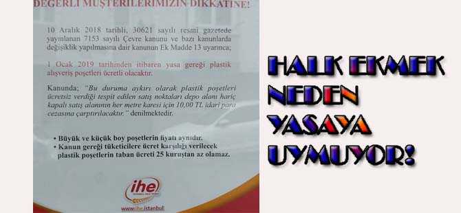 Halk Ekmek ise satış noktalarının camına astırdığı yazıda poşetleri parayla sattığını duyuruyor. Ama ekmek satış noktalarında poşetlerin uygulamadan muaf olduğunu yazmıyor.