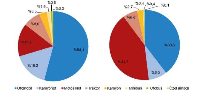 Haziran ayı sonu itibarıyla trafiğe kayıtlı taşıtların %54,1'ini otomobil, %16,2'sini kamyonet, %15,2'sini motosiklet, %8,0'ını traktör, %3,5'ini kamyon, %1,9'unu minibüs, %0,8'ini otobüs ve %0,3'ünü özel amaçlı taşıtlar oluşturdu.