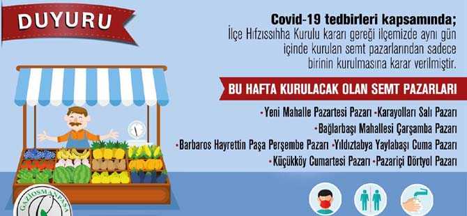Gaziosmanpaşa İlçe Hıfzıssıhha Kurulu kararı gereğince ilçe genelinde her gün bir pazarın kurulacağı açıklandı. İşte gün gün kurulacak semt pazarları...