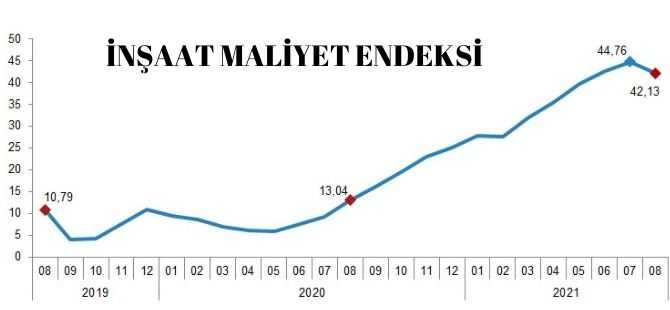 İnşaat maliyet endeksi, 2021 yılı Ağustos ayında bir önceki aya göre %0,93, bir önceki yılın aynı ayına göre %42,13 arttı.