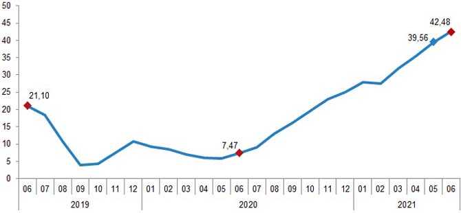 İnşaat maliyet endeksi, 2021 yılı Haziran ayında bir önceki aya göre %2,89, bir önceki yılın aynı ayına göre %42,48 arttı.