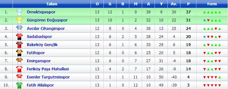 10.Grup14:30 Sadabad – Bakırköy Gençlik (Nurtepe) 1-714:30 Fatih – Avcılar Cihangir (Fatih Mimarsinan)15:30 Esenler Turgutreis – Feriköy Paşa Mahallesi (Esenler Bld) 1-016:30 Örnektepe – Fatih Hilal (Seyrantepe) 6-116:30 Emirgan – Güngören Doğuş (Bahçeköy Orman Fakultesi) 2-7