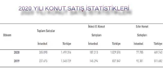 İstanbul'da 2020 yılında konut satışları bir önceki yıla göre %11,5 artarak 265 bine ulaştı. 2020 yılında en yüksek konut satışının gerçekleştiği ay 39 bin konut satışı ile Temmuz ayı olurken en düşük konut satışının gerçekleştiği ay ise 6 bin konut satışıyla Nisan ayı oldu. İstanbul hariç diğer illerin toplam satış rakamlarına bakıldığında ise konut satışları bir önceki yıla göre %11,1 artarak 1 milyon 234 bine ulaştı.