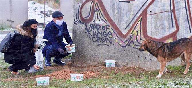 Gönüllü Deniz Tuğlu ise “Sevgiyle buradayız. Bu soğukta sevgi içimizi ısıtıyor. En çok mağdur olan köpekler, kediler bir şekilde baş edebiliyor. Onlara da yardım ediyoruz ama köpeklere ulaşmak zor. O yüzden belediyelerin yardımıyla dağ, bayır, soğuk demeden sizlerle beraber sevgi dağıtıyoruz. Sevgi de gönülleri ısıtıyor. Hiç üşümüyoruz.” dedi.