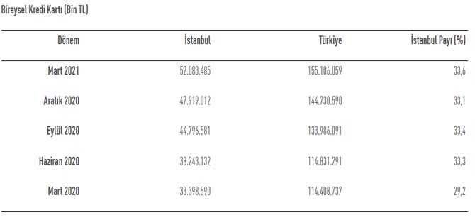 Türkiye'deki toplam bireysel kredi kartı harcamalarının %33,6'sının gerçekleştiği İstanbul'da 2021 Mart sonunda bir önceki yılın aynı dönemine göre harcamalar %55,9 artarak 52 milyar TL'ye ulaştı. Aynı dönemde Türkiyedeki toplam bireysel kredi kartı harcamaları ise %35,6 artarak 155 milyar TL'yi geçti.
