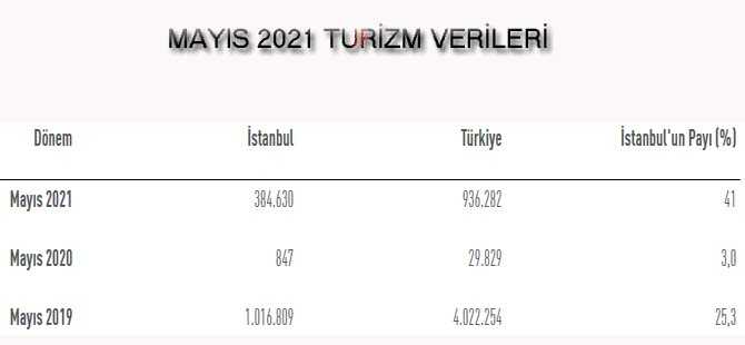2020 yılının Mayıs ayında İstanbul'da konaklayan toplam turist sayısı 111 bin iken 2021 yılının aynı döneminde bu sayı 421 bine yükseldi; konaklama tesislerine gelen yerli turist sayısı 190 bine, yabancı turist sayısı ise 230 bine ulaştı. Konaklama tesislerinde toplam geceleme süresi ise bu dönemde 892 bine ulaştı.