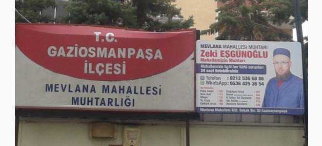 Gaziosmanpaşa Mevlana Mahalle Muhtarlığı girişinde bulunan tabela dikkat çekiyor.