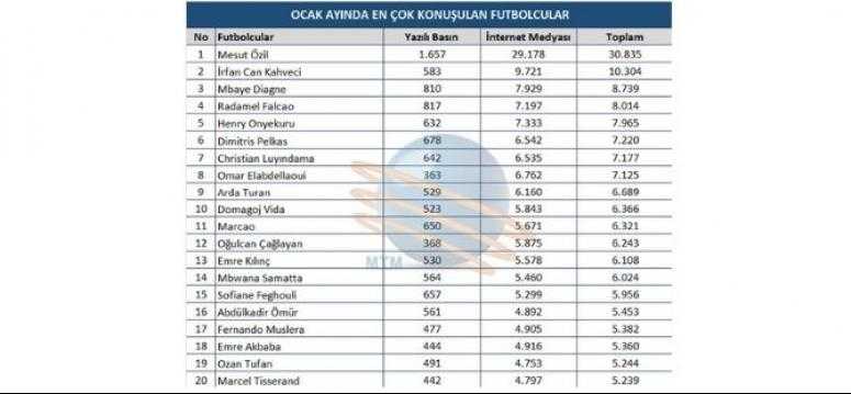 Ocak ayında medyanın en çok konuşulan takımları, futbolcuları, kulüp yöneticileri, teknik direktörleri ve hakemleri belli oldu. Medya Takip Merkezi’nin (MTM), Türkiye Spor Yazarları Derneği için hazırladığı rapora göre, ay boyunca medyanın spor gündeminde en çok yer alan takım Fenerbahçe olurken, sarı-lacivertli takımın renklerine kattığı Mesut Özil ise adını zirveye yazdırarak en popüler futbolcu olmayı başardı.