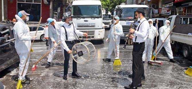 Gaziosmanpaşa ve Eyüpsultan ilçelerinin sınır noktası olan Şükran Caddesi’nde yapılan çalışmalara iki belediyeden toplam 20 araç ve 50 personel katıldı. Dezenfekte işlemi yapan temizlik görevlilerine bando takımı da müzikle eşlik etti. Çalınan şarkılar eşliğinde oynayıp halay çeken temizlik ekipleri, Ramazan Bayramı öncesinde vatandaşlara moral verdi. Pencere ve balkonlarından çalışmaları izleyen vatandaşlar alkış tutarak temizlik ekiplerine destek oldu.