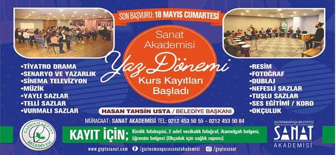 Sanat kültürünü yaygınlaştırmak ve çocukların sanatsal gelişimine katkı sağlamak amacıyla hizmet veren Gaziosmanpaşa Belediyesi Sanat Akademisi’nde yaz dönemi kurs kayıtları başladı. 7 yaş ve üzeri tüm çocukların katılabileceği kurslar; vurmalı sazlar, telli sazlar, yaylı sazlar, nefesli sazlar, tuşlu sazlar, ses eğitimi-koro, dublaj, tiyatro drama, senaryo ve yazarlık, resim, müzik, sinema-televizyon, fotoğraf ve okçuluk olmak üzere 14 branşta gerçekleşecek.