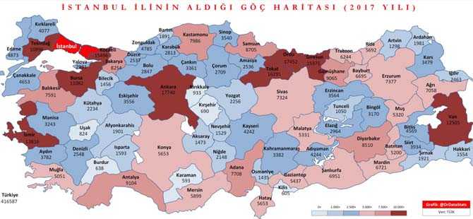 Medya takip ve raporlama ajansıPRNet, 81 ilden İstanbul’a yapılan göç istatistiklerini inceledi. PRNet’inTürkiye İstatistik Kurumu’ndan (TÜİK) ve medya yansımalarından derlediği bilgilere göre, 2017 yılında Türkiye genelinden toplam 416 bin 587 kişi İstanbul’a göç etti. İstanbul’a en çok göç eden il ise 17 bin 740 kişiyle Ankara oldu. Ankara’yı 17 bin 452 kişiyle Ordu, 16 bin 291 kişiyle de Tokat takip etti.