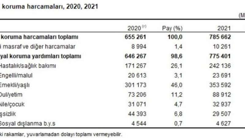 Sosyal koruma harcamalarının gayrisafi yurt içi hasıla (GSYH) içindeki payı 2021 yılında %10,8 oldu. Sosyal koruma yardımlarının GSYH içindeki payı ise %10,7 olarak gerçekleşti. Risk/ihtiyaç grupları bazında bakıldığında, emekli/yaşlılara yapılan harcamaların %4,9 ile en büyük paya sahip olduğu görüldü. Bunu, %3,3 ile hastalık/sağlık bakımı harcamaları ve %1,2 ile dul/yetim harcamaları takip etti.