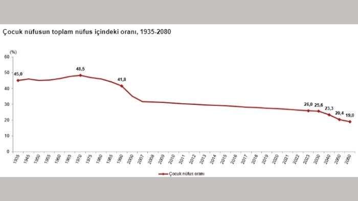 Nüfus projeksiyonlarına göre çocuk nüfus oranının 2030 yılında %25,6, 2040 yılında %23,3, 2060 yılında %20,4 ve 2080 yılında %19,0 olacağı öngörüldü.