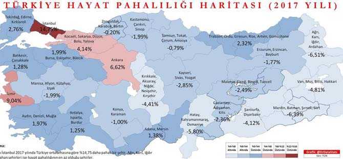 Medya takip ve raporlama ajansı PRNet, Türkiye’deki hayat pahalılığı konulu araştırmayı inceledi. PRNetin Türkiye İstatistik Kurumu (TÜİK) ve medya yansımalarından derlediği bilgilere göre, 2017 yılının en pahalı şehrinin İstanbul olduğu belirlendi. Rapor, Türkiye ortalamasına göre ele alınırken, İstanbul’un diğer şehirlerine oranla yüzde 14,75 ile daha pahalı bir şehir olduğu anlaşıldı. İstanbul’u yüzde 9,04 ile İzmir, yüzde 6,62 ile Ankara, yüzde 4,14 ile de Kocaeli, Sakarya, Düzce, Bolu ve Yalova takip etti.