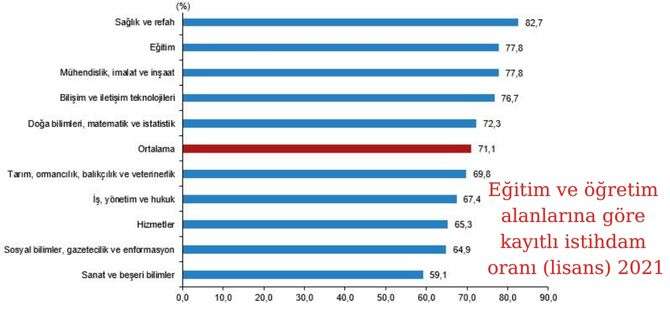 Lisans mezuniyet alanları göz önüne alındığında, kayıtlı istihdam oranının en yüksek olduğu ilk beş eğitim ve öğretim alanı; sağlık ve refah (%82,7), eğitim (%77,8), mühendislik, imalat ve inşaat (%77,8), bilişim ve iletişim teknolojileri (%76,7) ile doğa bilimleri, matematik ve istatistik (%72,3) olarak gerçekleşti.