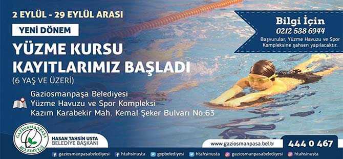 Gaziosmanpaşa Belediyesi yüzme kurslarına yeni dönem kayıtları başladı. 6 yaş ve üzeri herkesin katılabileceği eğitimlere son başvuru tarihi, 29 Eylül Pazar.